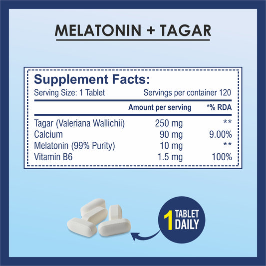 Brexhealth Melatonin 10Mg + Tagar 250Mg Supplement With Vitamin B6 And Calcium | Non-Habit Forming, Restful Sleep, Improved Focus, Relaxed Mind | Good For Eye Health - 120 Vegetarian Tablets