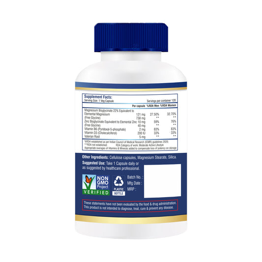 Brexhealth Neomg+ Highest Bioabsorption of Magnesium Glycinate With Zinc, Valerian Root, Vitamin B6 & D3-120 Veg Capsules