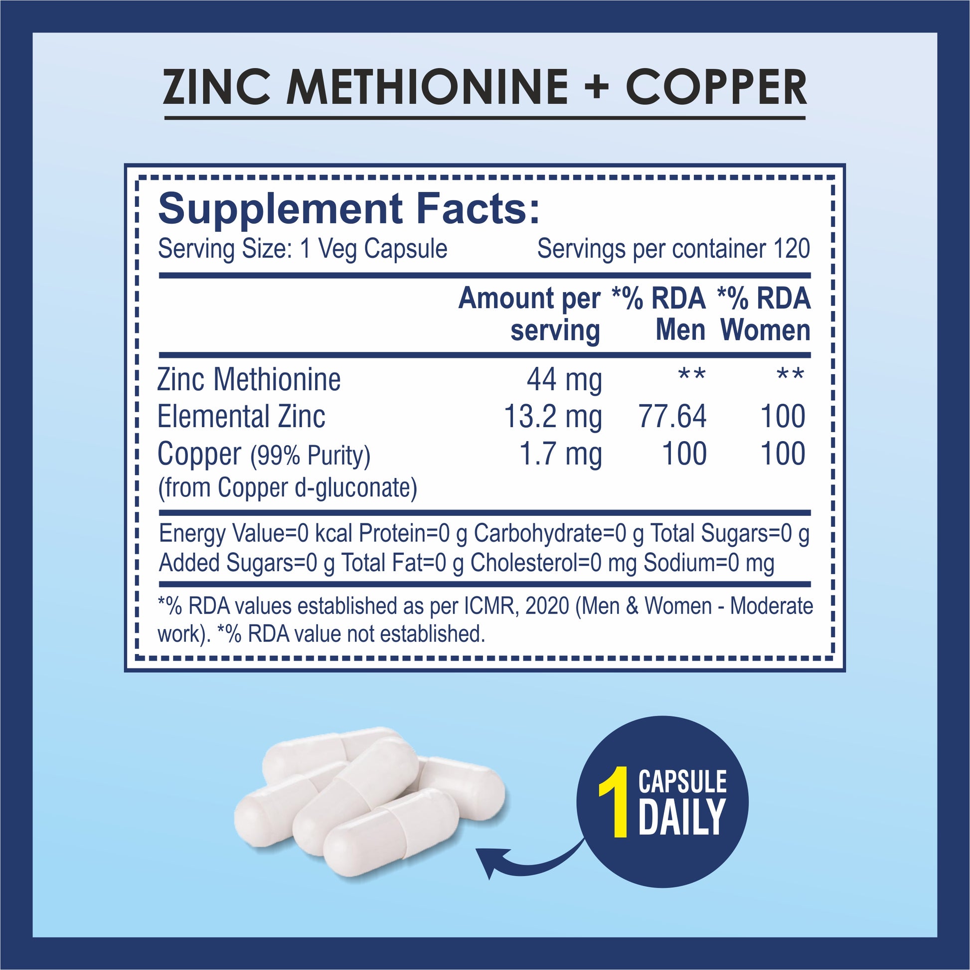 - Brexhealth Zinc Methionine + Copper supplement has 13.2mg Elemental Zinc & 1.7 mg Elemental Copper